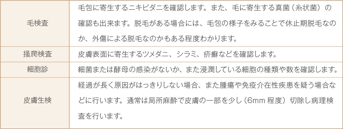 皮膚に関すること、生活に関することなど細かくお話を聞かせて頂きます。これまでの経過やわんちゃんや猫ちゃんの生活スタイルなども皮膚病の原因を探る重要な手がかりになります。いつ頃から症状が出たのか、そしてどのような経過なのか、家でのわんちゃんや猫ちゃんの様子などを飼い主様からの目線でのお話を教えて頂ければと思います。