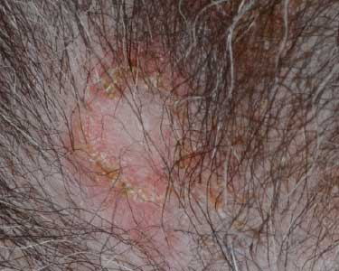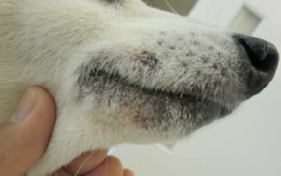 皮膚に皺や脂の分泌が多い犬でみられます。マラセチアという脂の好きな酵母に関連した皮膚病で、皺が多く脂のたまりやすい首、内股、腋、腹部に多くみられます。これら部位の皮膚が赤くなり、フケが多くなり、痒みを伴います。