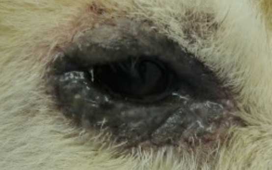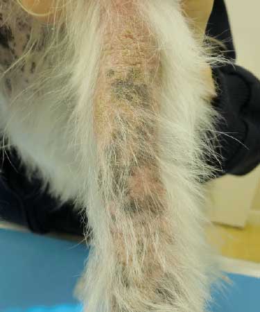 毛包に常在するニキビダニが過剰に増殖することで皮膚に炎症をおこす病気です。この病気には動物側の要因も大きく、免疫が低下するような要因を考えていかなければなりません。もちろんまだ免疫能がしっかりしていない若齢の個体では成長と共に良くなることもありますが、高齢の 個体では免疫能が低下する全身の問題がないか調べる必要があります。治療にはニキビダニの駆虫と一緒にシャンプー療法で皮膚のコンディションを改善していきます。