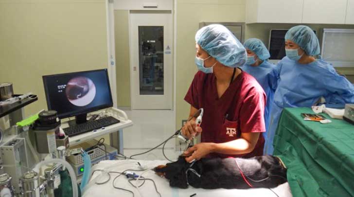 慢性外耳炎の約50~80%に二次的な中耳炎が併発すると報告されています。慢性化した症例では頭部のレントゲン検査と合わせて、ビデオオトスコープにより中耳炎の評価を行います。MRI やCTの評価も必要になることがあります。