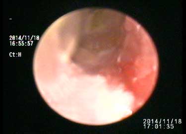 耳道内や鼓室胞内には腫瘍が形成されることがあります。腫瘍により耳道の物理的な圧迫による狭窄や二次的な感染がおき、耳の中が化膿しているような状態、耳だれ(耳漏)になってしまうことがあります。良性のポリープや耳垢腺腫であればビデオオトスコープでは生検鉗子を用いて、非侵襲的な切除生検を行うことができます。