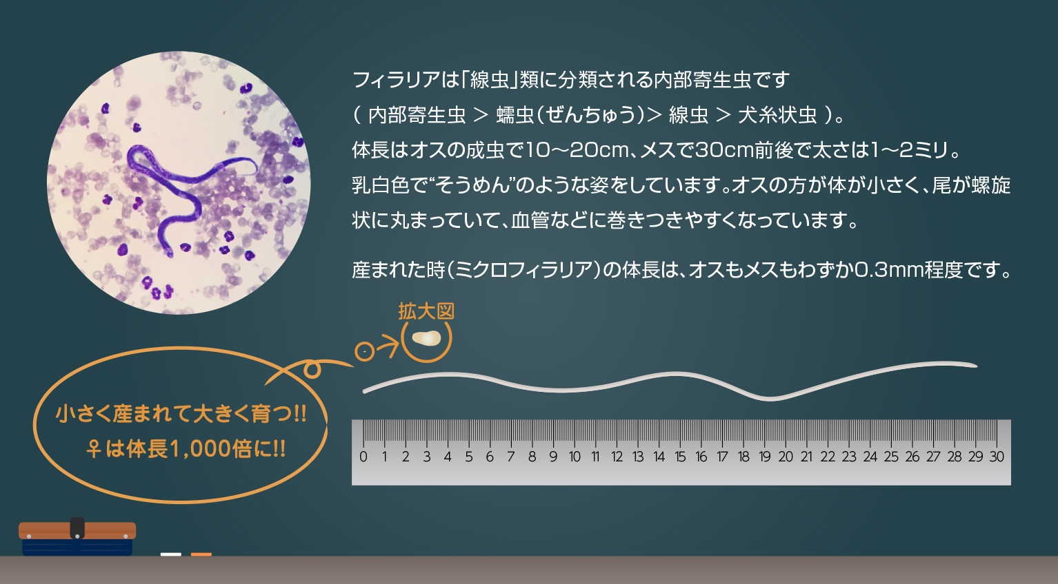 - 形態:ミクロフィラリアと呼ばれる体長約0.3mmの仔虫。フィラリアはメスの体内で卵が孵化する卵胎生のため、幼虫の姿で産まれます。