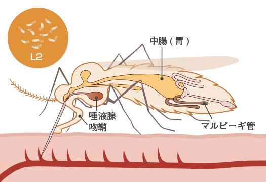 - 成長:蚊に吸われて蚊の体内に侵入できたミクロフィラリアは、中腸(胃)で1日過ごした後、腎細管であるマルピーギ管に移動して脱皮し、10日前後でL2になります。