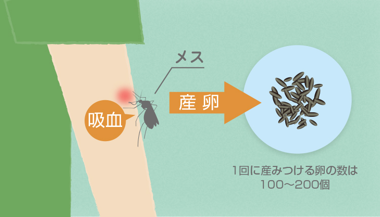 さなぎから羽化して成虫になった蚊の寿命は約1カ月。メスはオスと交尾して一生分の精子を蓄え、死ぬまでに産卵を3回程くり返します。1回に産みつける卵の数は100〜200個(ヒトスジシマカの場合)。卵塊で数多く産むためタンパク質等の栄養補給が必須となり、人や動物を刺して吸血します。1回の吸血量は蚊自身の体重の2〜3倍量におよぶといわれています。