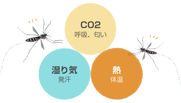 蚊は二酸化炭素、温度、水分を手がかりにして吸血ターゲットを探します。呼気や体臭、体温、汗などに敏感に反応し、すばやく接近してとまります。