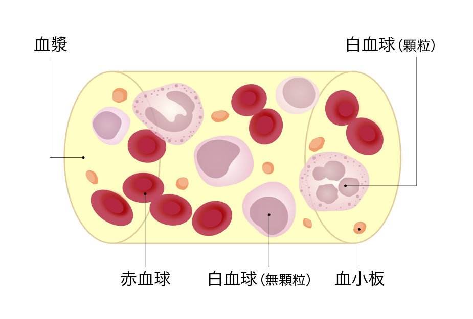 血漿(けっしょう)成分で構成されており、血漿の中に血球が浮かんだ状態で血管内を循環しています。