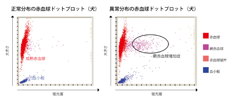 項目の数値が血球ごとに色分けされた点の群集として表出され、正常像と比べて変化が大きければ異常を示唆する所見である可能性があります。