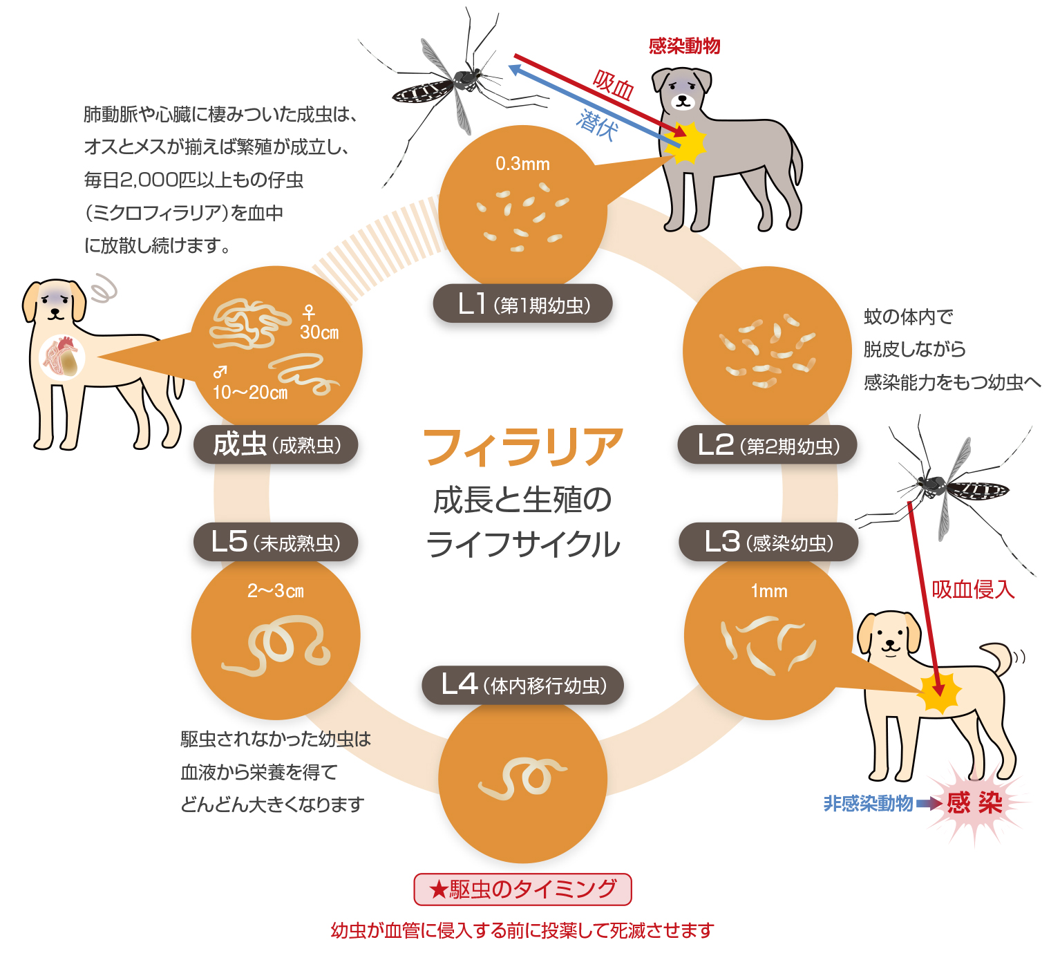 フィラリアは5段階の成長ステージ(L1~L5※)を
