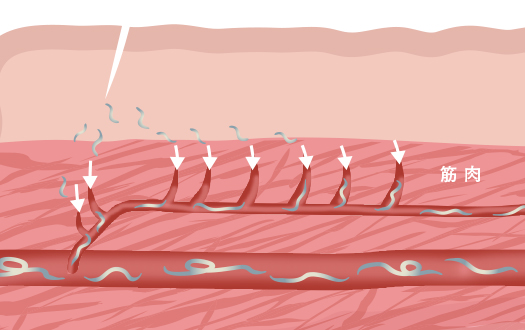 - 成長:蚊が吸血する際、L3は分泌液に乗って蚊の体外に押し出され、吻鞘を伝って犬(猫)の皮膚に降下、針の傷穴から体内(皮下)へと侵入します【感染】。皮下組織に潜伏し、3~10日で脱皮してL4となり、筋肉へと移動します。